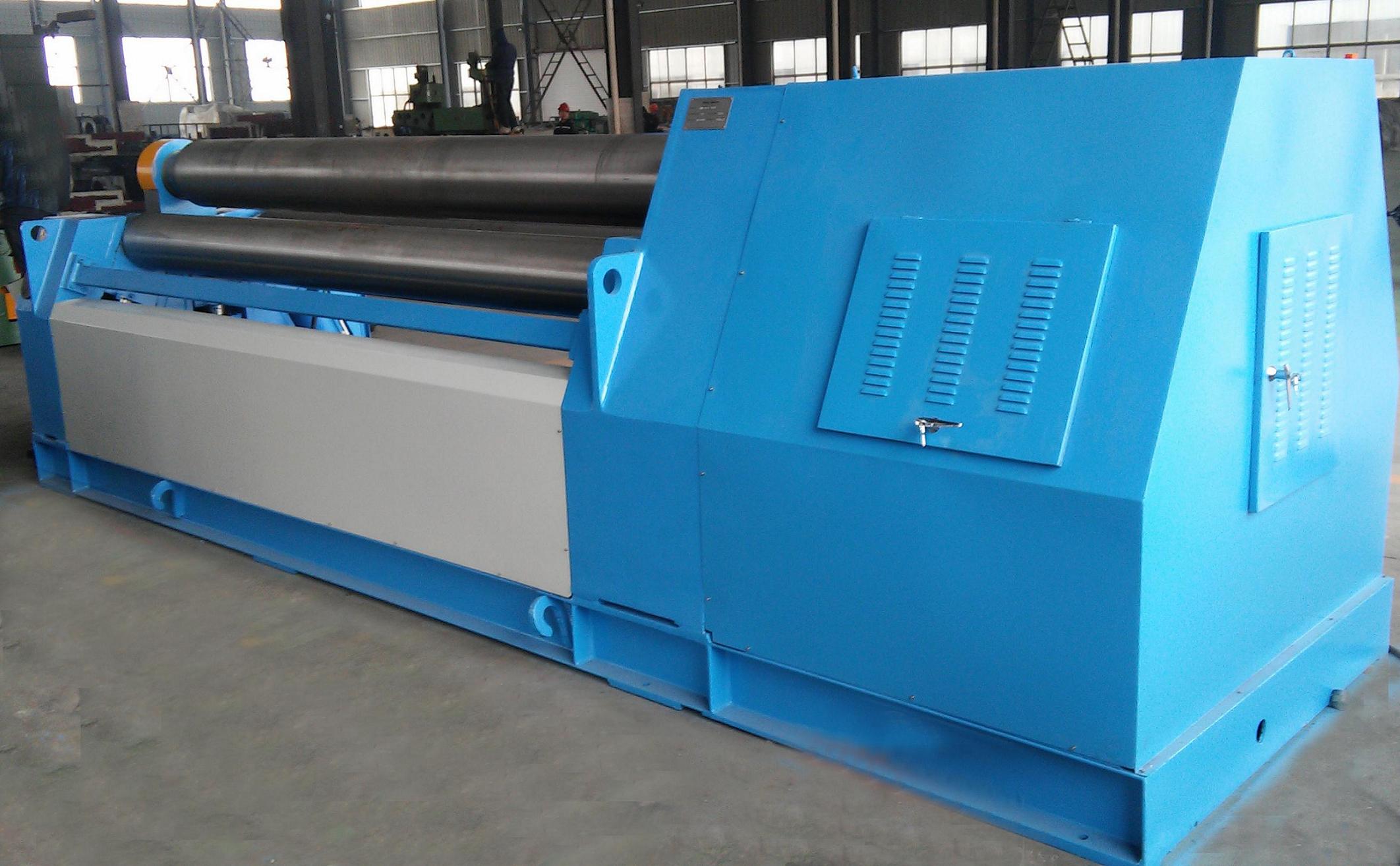 T4-10T3000W Plate Bending Machine is a type of double pinch plate bending machine. Each of the rollers is separate driven. Rollers rectilinear slide ways coated with antifriction material, no maintenance, suit to heavy duty loading, smooth and stable positioning. Spherical roller bearings are equipped on the rollers. All of the rollers in alloyed steel are induction hardening and heat treatment. All of the rollers will be grinded and polished after induction hardening treatment.